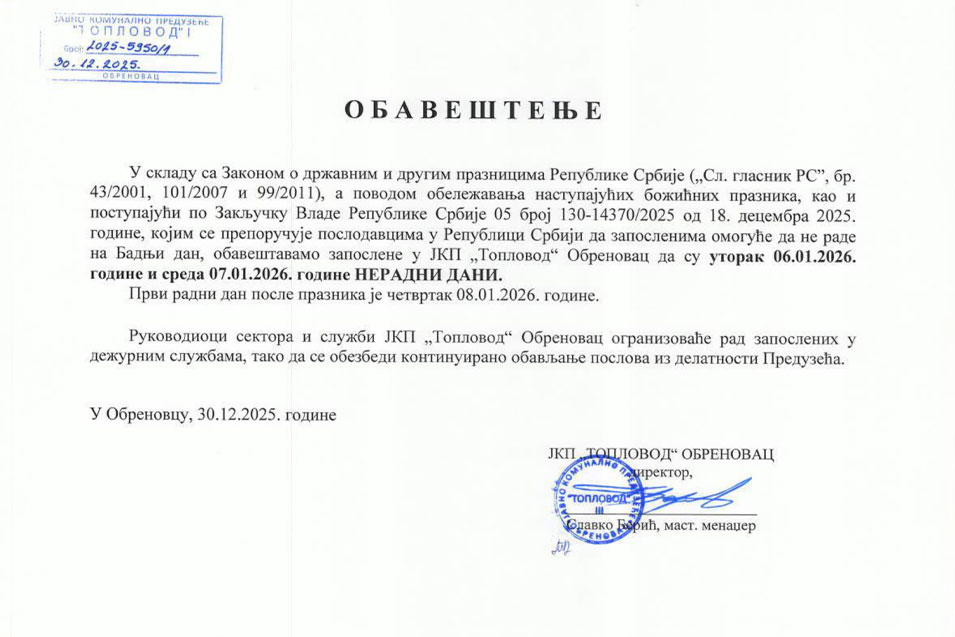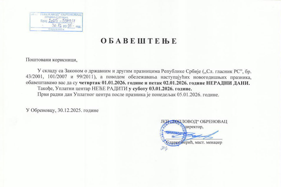 Обавештење корисницима услуга ЈКП "Топловод" Обреновац